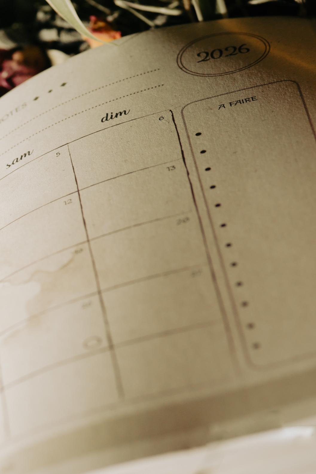 - également un agenda complet commençant le 01.01.2026 avec des calendriers annuels, mais aussi mensuels , hebdomadaires, et un cycle menstruel/lunaire par mois à compléter selon VOTRE cycle, totalement unique.